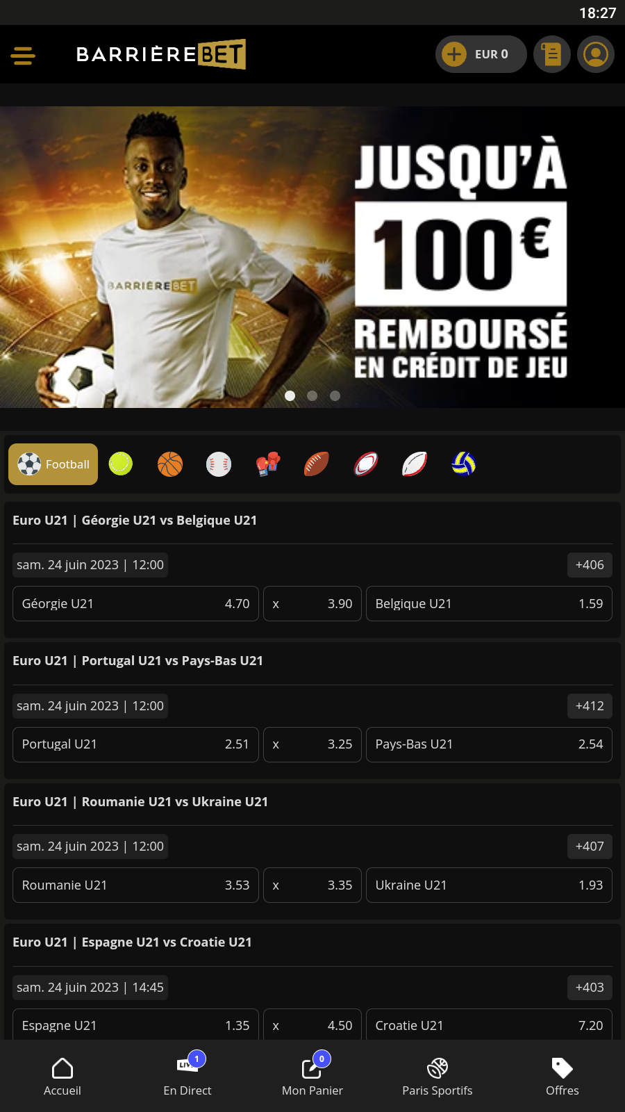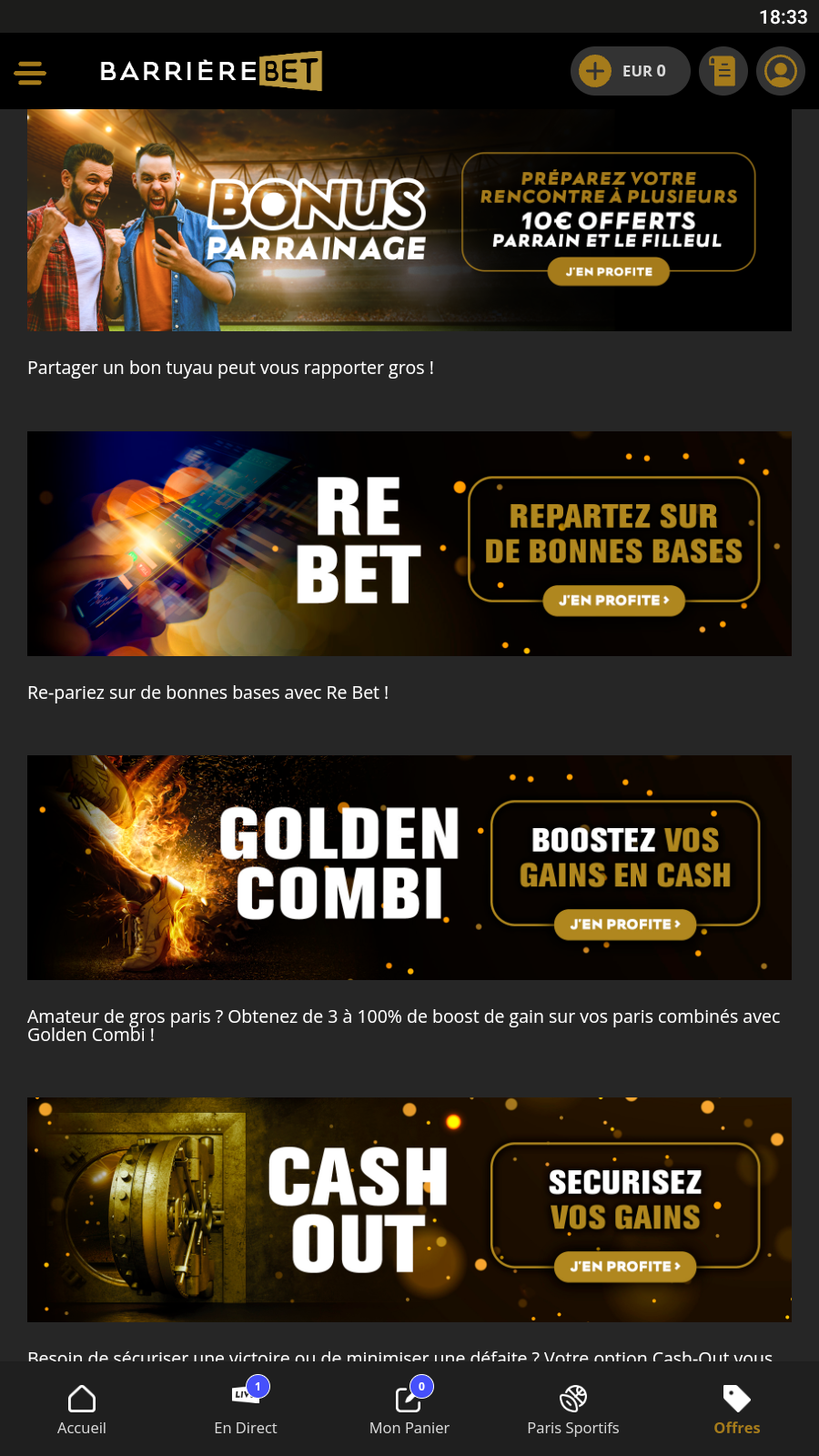 BarriereBet fait partie du groupe Barrière. Il s’agit d’un grand groupe de sociétés en France. Elle spécialisées dans les jeux de hasard. Cela donne aux clients du bureau confiance dans la fiabilité et la qualité du bookmaker. Les parieurs entier font l'éloge de sa fiabilité exceptionnelle et de sa sécurité sans compromis. De l'inscription au retrait des gains, chaque étape est soigneusement conçue. Cela permet d'offrir une expérience fluide et sans accroc. La plateforme est dotée d'une interface conviviale qui ravit les joueurs. Il leur permettant de naviguer aisément parmi les différentes sections et de trouver rapidement les événements sportifs sur lesquels ils souhaitent parier. En outre, Barrière Bet a développé une application mobile, disponible sur iOS et Android. Elle vous permet de profiter pleinement de l'excitation des paris sportifs où que vous soyez. Plongez dans l'univers des paris avec Barrière Bet.