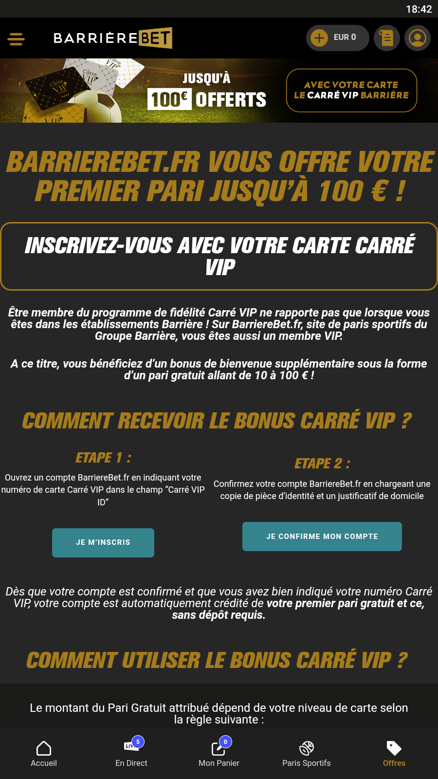 Que vous avez compris comment installer cette application sur votre téléphone mobile ou votre tablette Android et iOS, il est temps de passer à l'étape suivante. Créer un compte joueur. Tout opérateur de paris sportifs impose de identité obligatoire de ses clients. Ensuite, la validation de votre compte est requise. Ou vous pouvez vous connecter à l’aide de vos identifiants créés. Bien entendu, si vous possédez un compte déjà existant sur la plateforme. Il y a une autre caractéristique importante qu'il ne faut pas oublier. Lors de l'inscription, vous pouvez saisir un code promo. Il permet recevoir un bonus de bienvenue allant jusqu'à 100€ si votre pari est perdu. En d’autres termes, c’est une sorte d’assurance. Grâce à elle, le premier pari est remboursé. Les codes peuvent changer avec le temps. Par exemple, le code de Barriere Bet Betmax. Il permet aux joueurs de recevoir un bonus de 100€ maximum. Il a été publié de Barriere Bet en janvier 2024 et peut ne pas être disponible à d'autres moments.