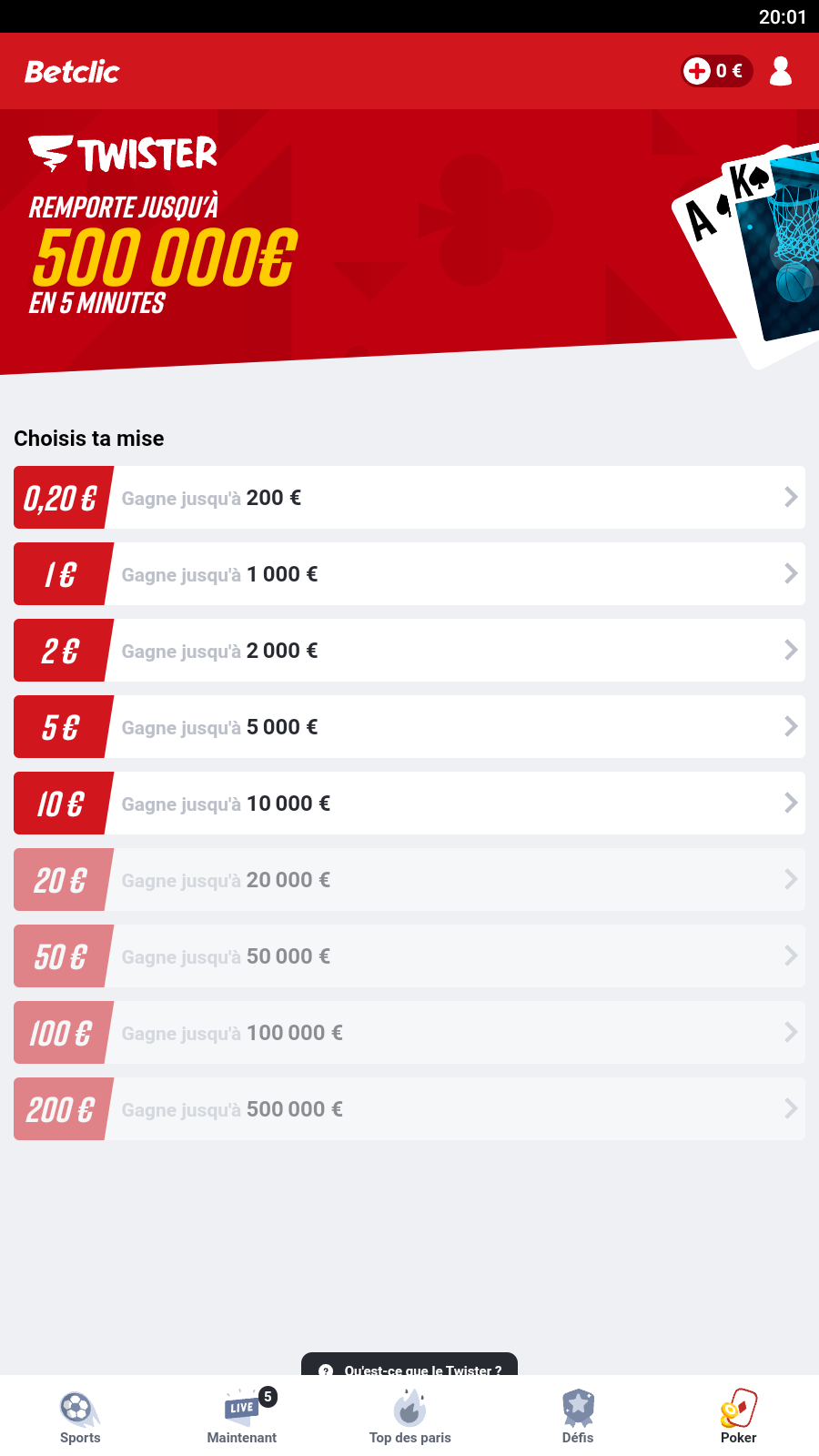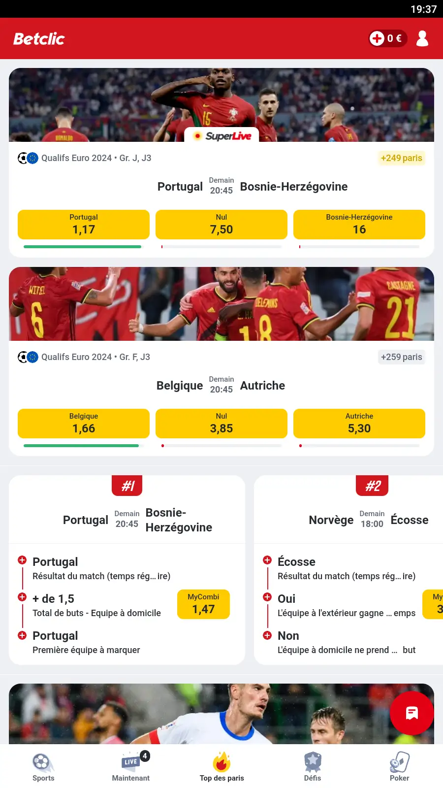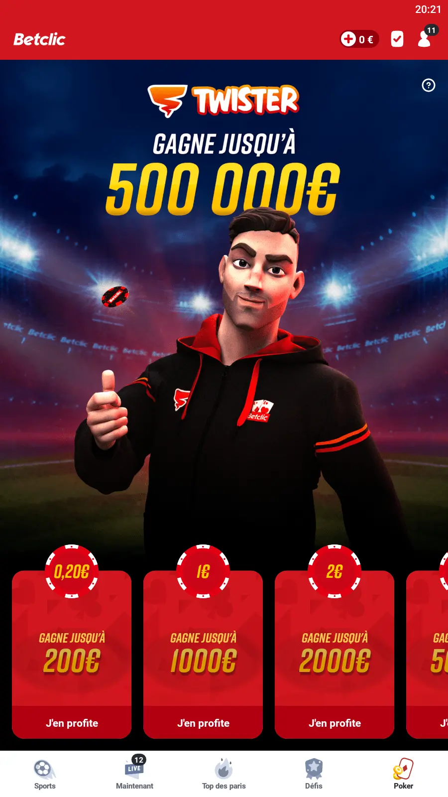 Pour les amateurs de poker, l'application Betclic est un must. Installez le programme Betclic Poker et rejoignez les tables virtuelles où vous pouvez jouer contre des joueurs de poker du monde entier. Testez vos compétences! Bluffez, analysez et gagnez de gros pots dans des parties serrées et passionnantes. Avec l'application Betclic Poker, vous pouvez vivre toute l'excitation du poker. Inscrivez-vous aujourd'hui et rejoignez les 11 millions de parieurs.
