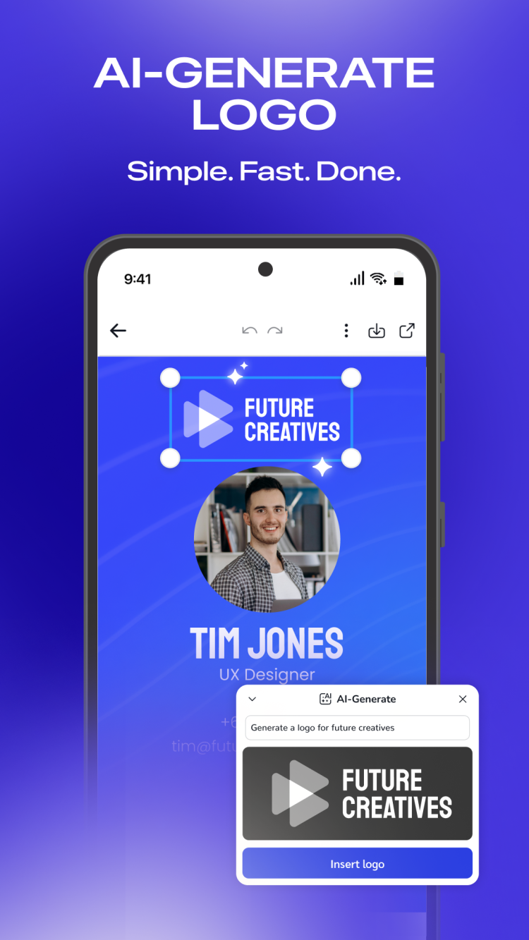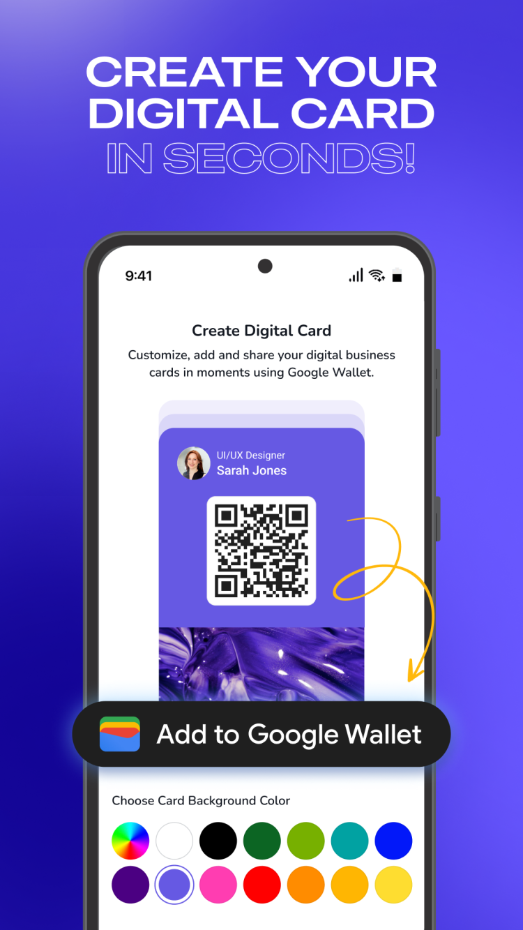 Avec Business Card Maker, créer des cartes de visite numériques professionnelles est un jeu d'enfant. Aucune compétence ni expérience en design ou en retouche d'image n'est requise. Il vous suffit de personnaliser le design de votre carte de visite virtuelle, puis de saisir votre nom et vos coordonnées. Vous pouvez ensuite enregistrer votre création sur Google Wallet.