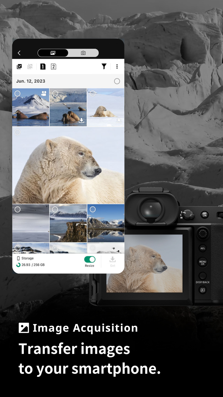 Après avoir établi une connexion avec votre smartphone via Bluetooth ou Wi-Fi, l'application vous permet de transférer automatiquement les images et les vidéos de votre appareil photo. Vous pouvez également parcourir la galerie manuellement et importer uniquement les images souhaitées.