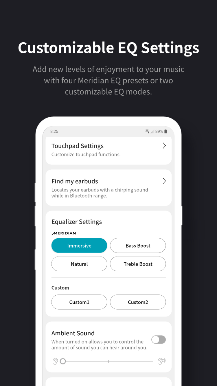Les écouteurs sans fil LG TONE Free sont sans aucun doute performants par défaut, mais leur utilisation nécessite l'installation d'un logiciel spécialisé. Ce programme vous offre un contrôle intuitif de vos écouteurs, permettant non seulement de régler le volume, mais aussi de configurer des paramètres supplémentaires. Vous pouvez configurer l'égaliseur manuellement ou en choisissant parmi plusieurs préréglages. Et pour que rien ne vous empêche d'écouter votre musique préférée, le programme vous permet d'ajuster le niveau de réduction du bruit.
