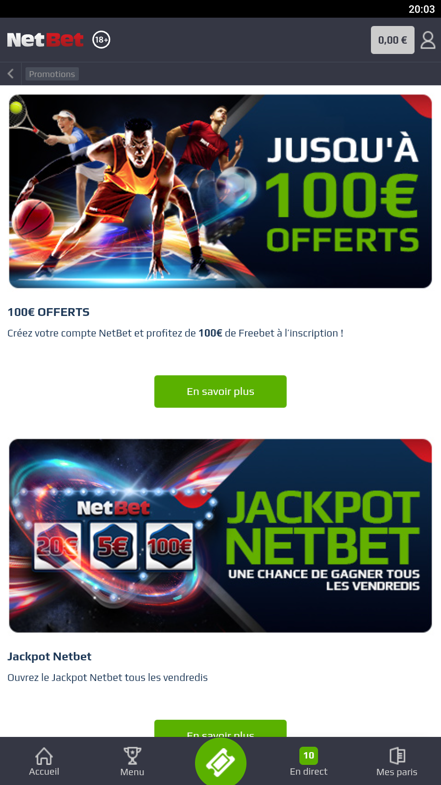 Lors de votre inscription, netbet vous propose de saisir un code promo. Nous vous recommandons de ne pas rater cette opportunité, puisque la plateforme vous permet d'obtenir jusqu'à 100€. Pour ce faire, vous devez confirmer votre compte et placez un premier pari. S’il est perdu, vous bénéficierez d’un remboursement pouvant aller jusqu’à 50 euros. Un bonus de bienvenue du même montant est crédité 30 jours après la confirmation du compte. Il est important que les conditions des promotions puissent parfois changer et vous devez les vérifier attentivement avant d'activer une promotion particulière. Par exemple, les conditions décrites ci-dessus étaient valables en décembre 2023, mais en 2024, les conditions pourraient changer. plus de détails peuvent être trouvés sur le site Web du programme dans la section promotions ou dans l'application.