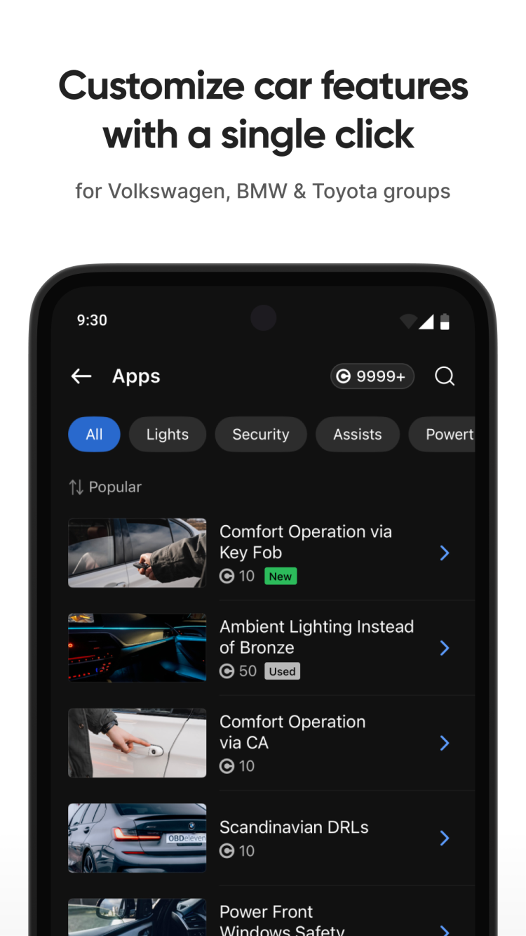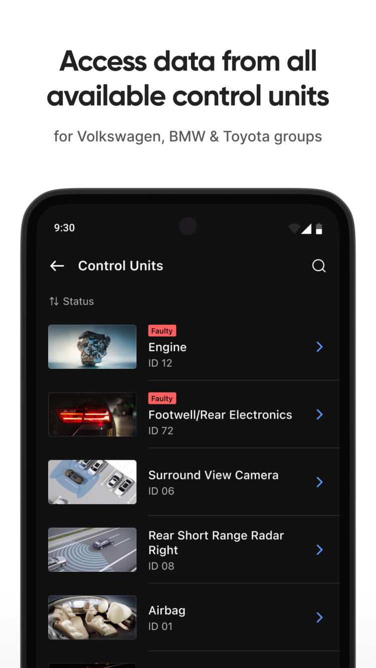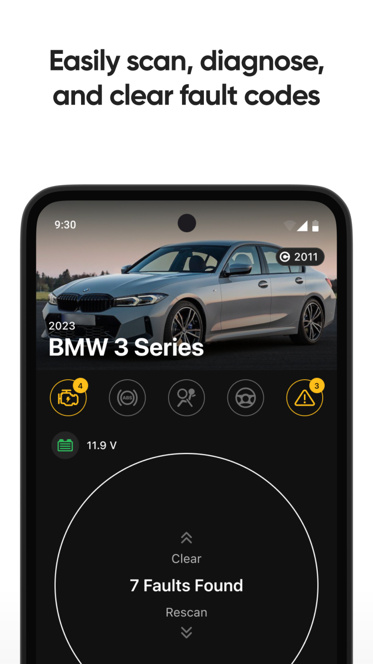 OBDeleven est une application mobile, officiellement sous licence des groupes Volkswagen, BMW et Toyota. Elle permet de diagnostiquer le moteur et la transmission, ainsi que d'identifier et de résoudre les problèmes courants, sans avoir à se rendre en centre de service.