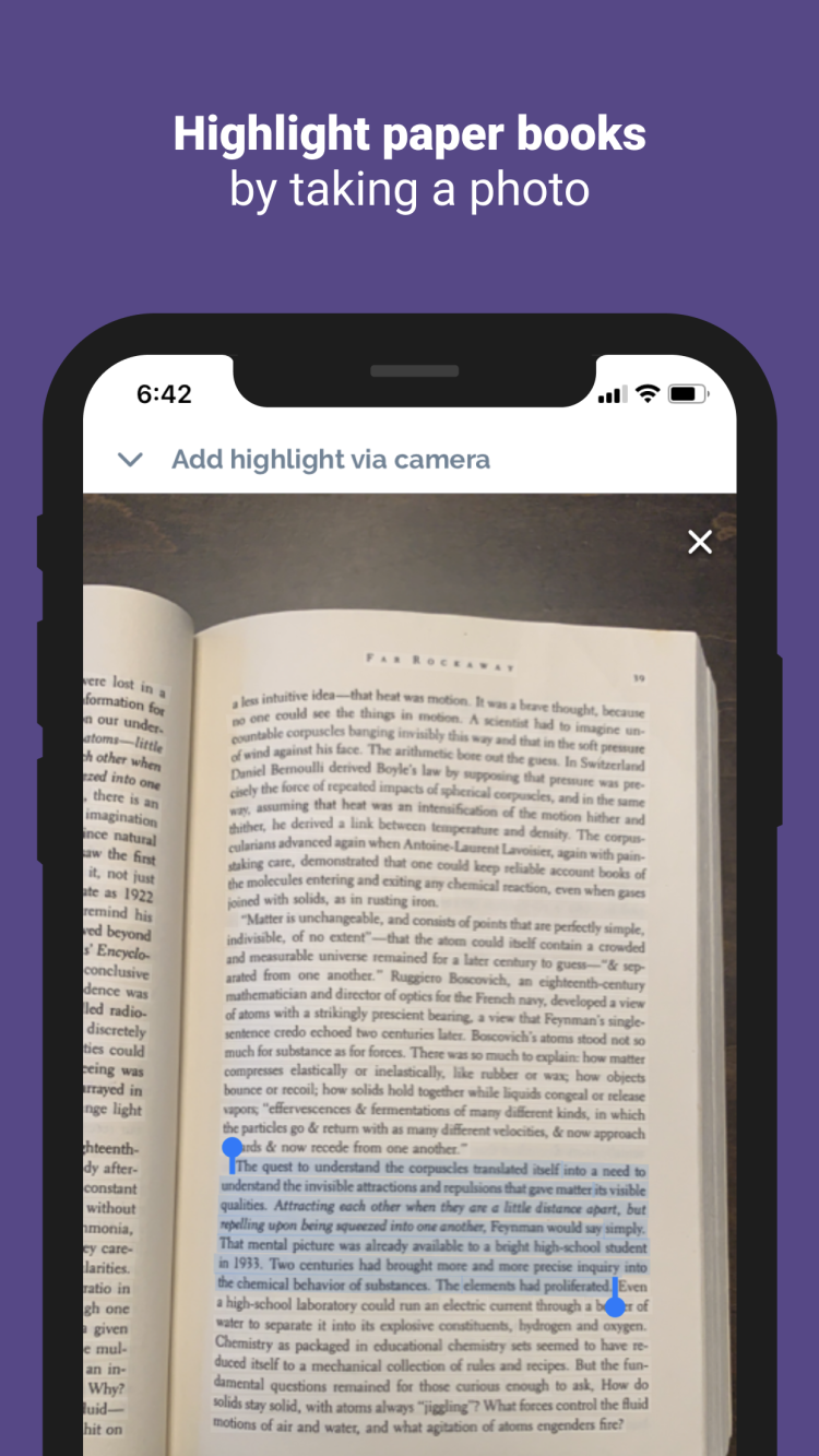 Connectez simplement votre compte via l'application : la liste de vos livres sera automatiquement mise à jour et la liste des citations sera enregistrée. Vous pouvez également saisir manuellement les titres de vos livres préférés ou prendre une photo du livre papier et y ajouter les idées souhaitées. Toutes les citations enregistrées seront enregistrées dans votre fil d'actualité personnel, où vous pourrez voir l'auteur et le titre du livre, et discuter avec une IA avancée pour découvrir des idées similaires dans différents livres.