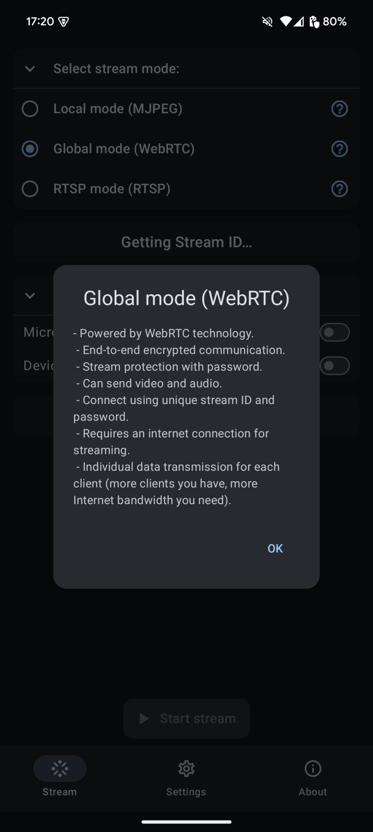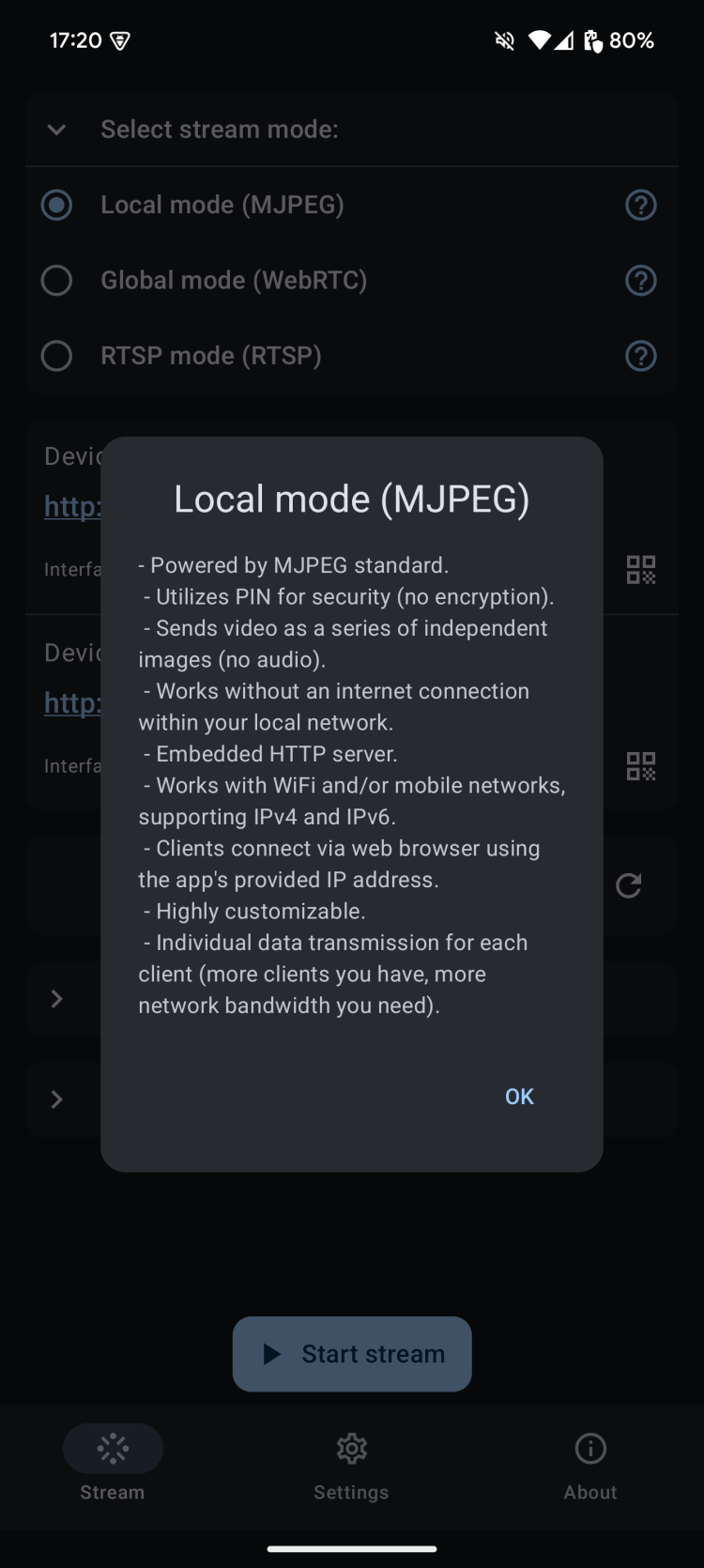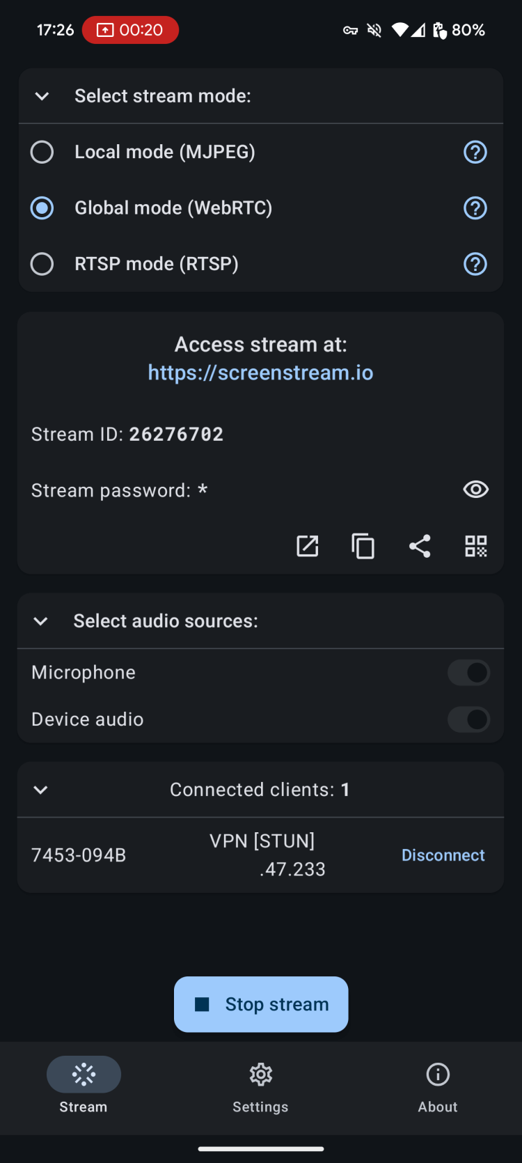 ScreenStream est l'assistant idéal pour ceux qui recherchent un moyen simple de partager des vidéos depuis leur smartphone avec leurs collègues, leurs clients, leur famille ou même leurs amis joueurs. Il vous permet de lancer instantanément la diffusion d'écran et de son, et d'y accéder depuis n'importe quel navigateur, sans fil, extension ni outil payant. Il suffit de lancer l'application pour générer une URL unique permettant d'accéder au flux depuis d'autres appareils : smartphones, tablettes, ordinateurs portables et de bureau. L'utilisateur peut définir un code PIN pour accéder au flux afin de protéger ses informations sensibles contre tout accès non autorisé. Mais ce qui distingue ScreenStream de la concurrence, c'est la possibilité de choisir entre trois modes :