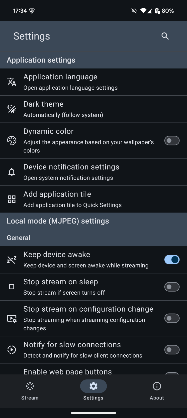 L'application ScreenStream permet également de régler la qualité et la résolution vidéo, de faire pivoter et de rogner l'image, et d'accéder à d'autres paramètres pour simplifier la gestion de la diffusion et de la consommation de trafic.