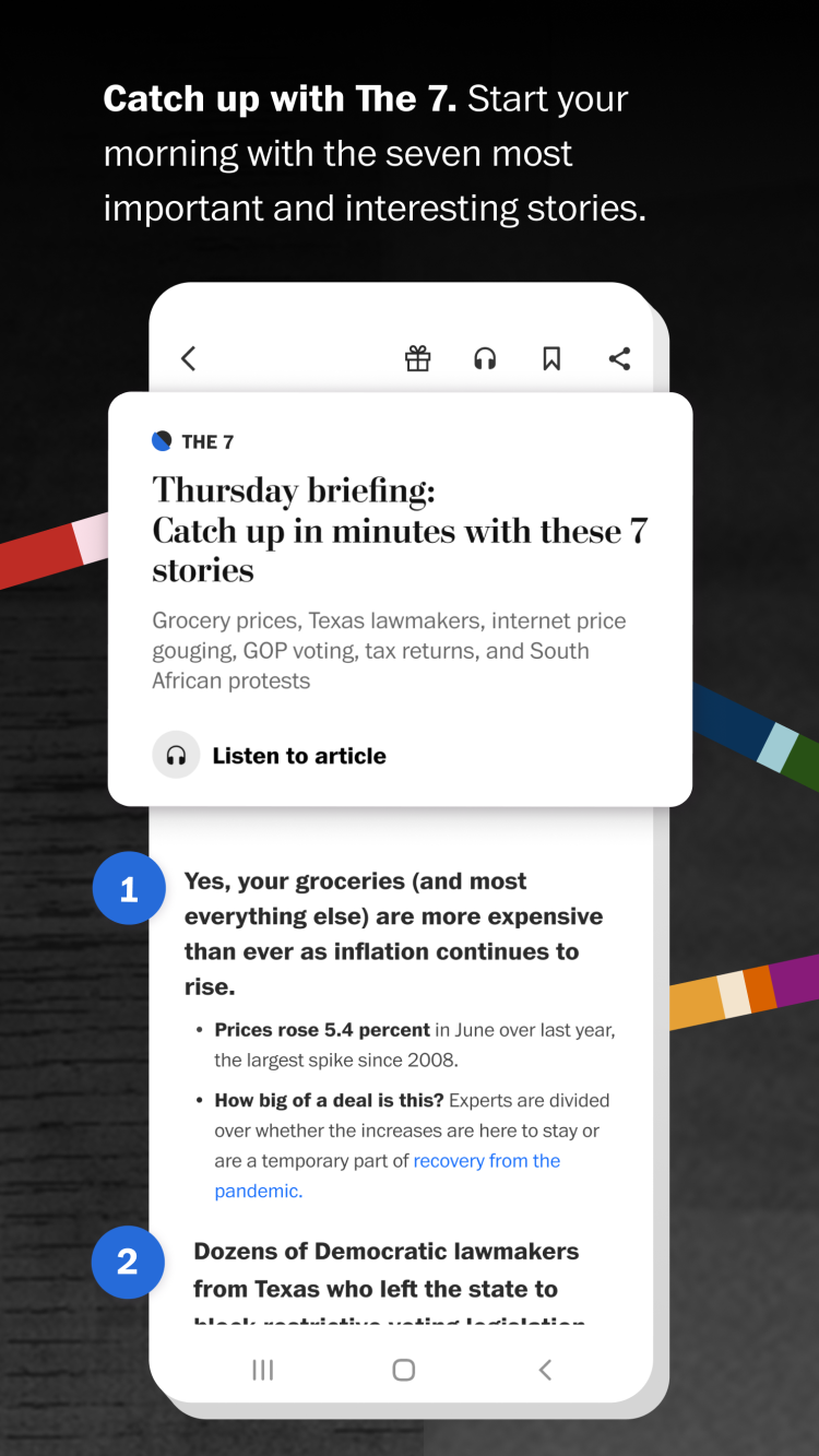 L'une des principales fonctionnalités de Washington Post APK est la section « Les 7 ». Elle vous aidera à démarrer chaque matinée en lisant les 7 articles les plus importants. Et pour vous libérer les mains pour votre café du matin, vous pouvez toujours utiliser la fonction de lecture à voix haute des articles.