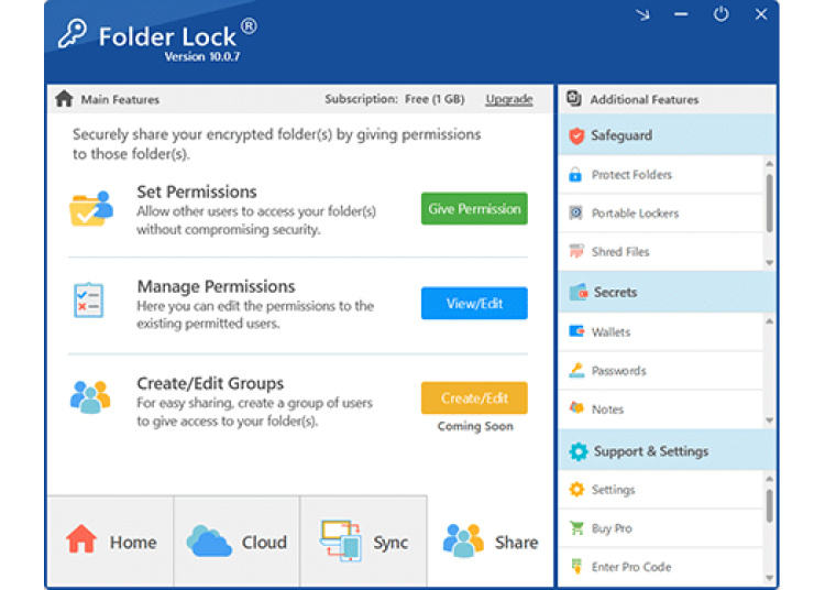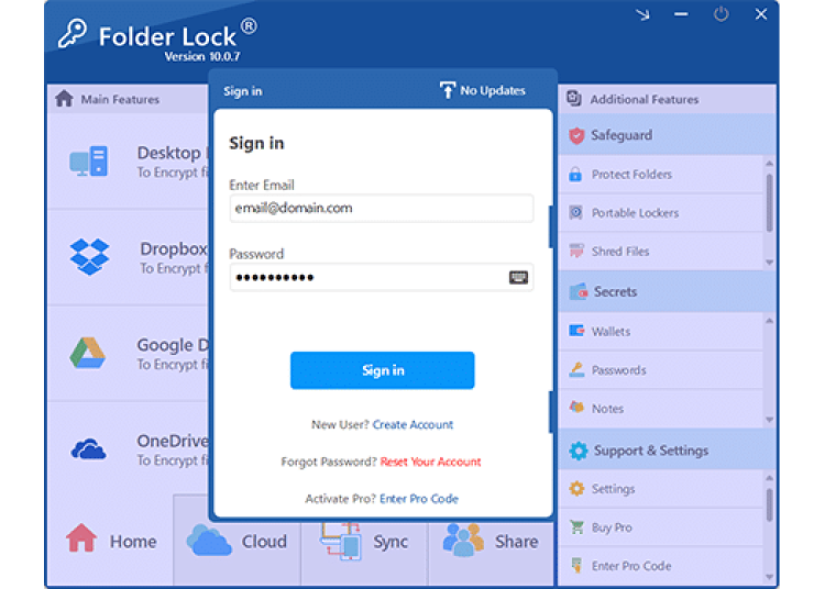 Folder Lock vous offre un chiffrement AES 256 bits à la volée ainsi que la synchronisation des fichiers chiffrés avec le stockage en nuage. Le logiciel crypte et synchronise automatiquement vos fichiers. Si vous ne souhaitez pas crypter vos fichiers ou vos dossiers, vous pouvez en verrouiller l'accès à l'aide d'un mot de passe, ou les cacher des regards indiscrets.